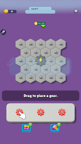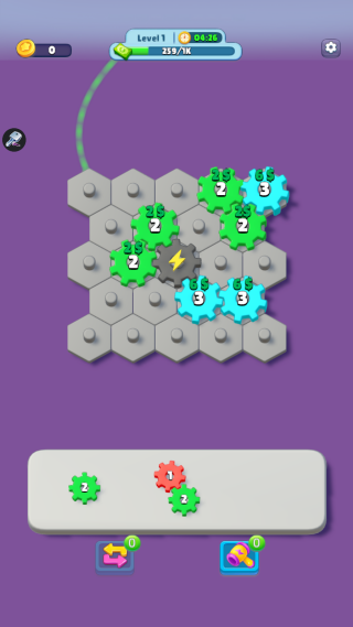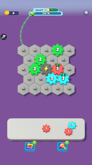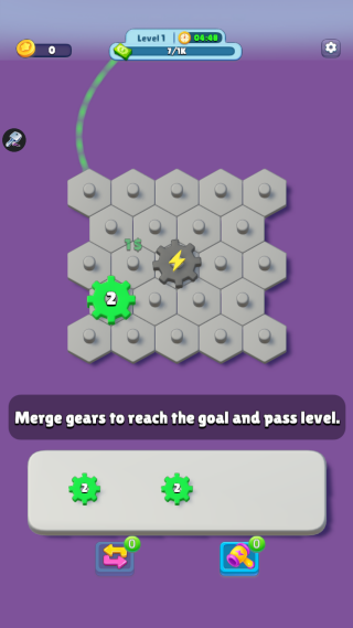 2.通过放置齿轮、合并相同类型的齿轮,逐步消除障碍,完成关卡目标;