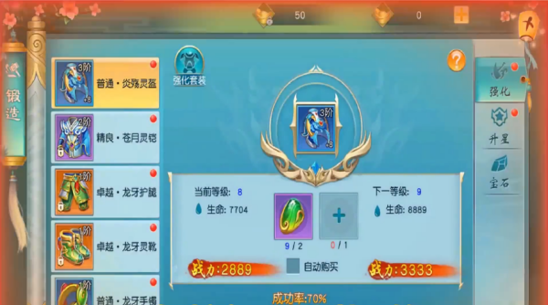 2、注重装备强化,优先选择高等级、高品质的装备(如 3 阶 “普通・炎殇灵盔”)进行强化。