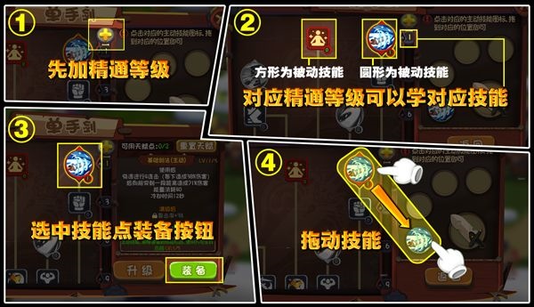 2、分步骤展示单手剑技能学习,先加精通等级,对应等级学被动和主动技能,选中技能点装备按钮,还可拖动技能调整位置。