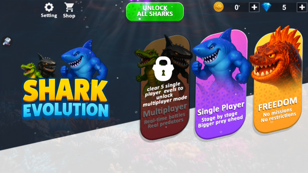 鲨鱼进化进食与生存是一款超有趣的海洋生物进化主题游戏。玩家在游戏里扮演一只小鲨鱼开启冒险,从幼崽起步,通过吃掉其他海洋生物或者同类来获得能量和资源,进而一步步进化。游戏背景是浩瀚无边的海洋世界,玩家要在残酷竞争里持续提升体型与能力,最终称霸海洋成为顶级掠食者。