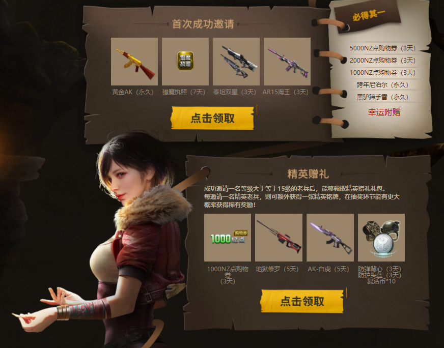 邀好友战长白领永久神器活动时间是8月16日至9月1日,活动期间在7月1日之后登陆过的玩家可以邀请好友共同游戏,成功邀请后可以根据邀请好的等级不同领取不同的奖励,玩家首次邀请成功就可以获得永久黄金AK+7天猎魔执照+3天泰坦双星+3天AR15海王,同时玩家还可以获得幸运附赠,在5000点券、2000点券、1000点券、跨年尼泊尔和黑驴蹄手雷中任获一款。玩家成功邀请15级以上的玩家回归,还可以额外领取一份大礼包。玩家成功邀请获得铭牌可以进行奖励兑换,也可以进行抽奖,奖池中也是包含了永久泰坦双星、10000NZ点券和永久跨年手雷。