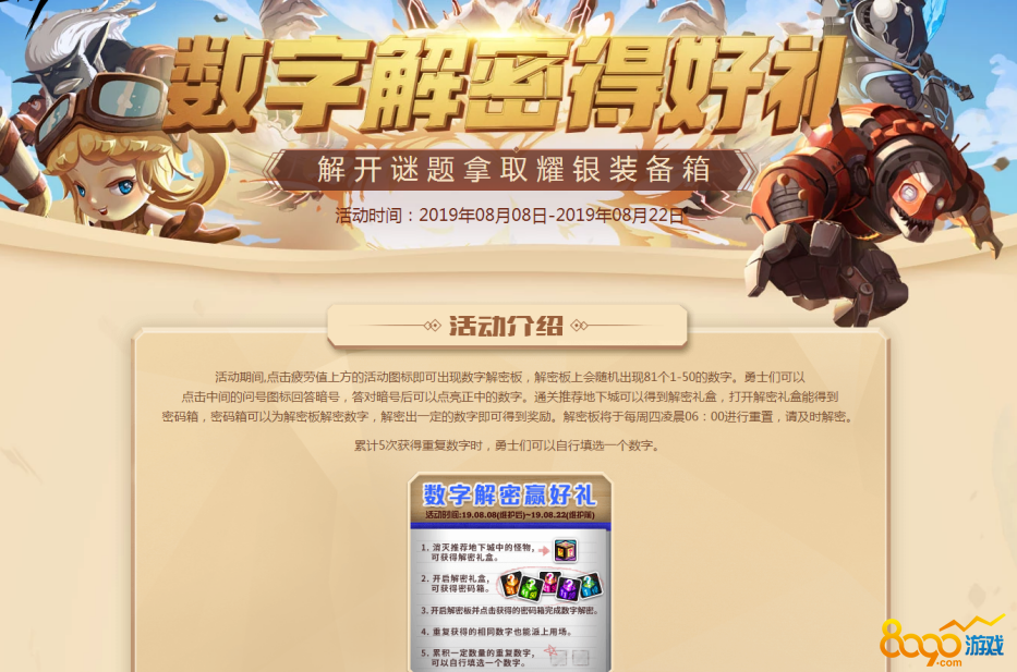 数字解密得好礼的活动时间为8月8日-8月22日,在活动时间内解密版上会随机出现1-59的数字,玩家输入正确的数字就可以获得最终奖励,8.19的幸运数字就是28哦。17级以上的玩家通关推荐地下城后有一定几率可以得到解密礼盒,解密礼盒以及密码箱将会在每天凌晨6:00删除。