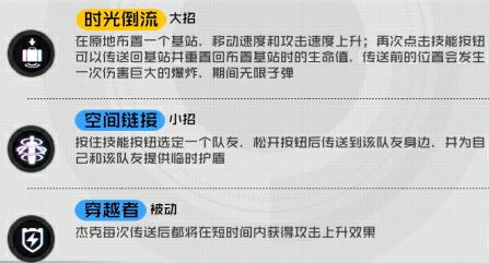 先说说技能被动技能效果适合快速加入战场加入后增加伤害(辅助:保护队友最好方式就是把对面全都灭了)传送(空间磁链)CD十秒选定一个队友,一秒延迟后传送过去,并且给队友套个小盾讲真,官方的介绍想突出这个盾的作用,保护队友但实际上..........盾不是特别厚持续时间又有点短........这就有点尴尬....所以我是完全抛弃辅助定位因为传送是全地图的无论队友在哪里只要视角对准(可以很模糊的瞄准,基本在屏幕上就行)