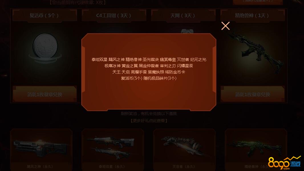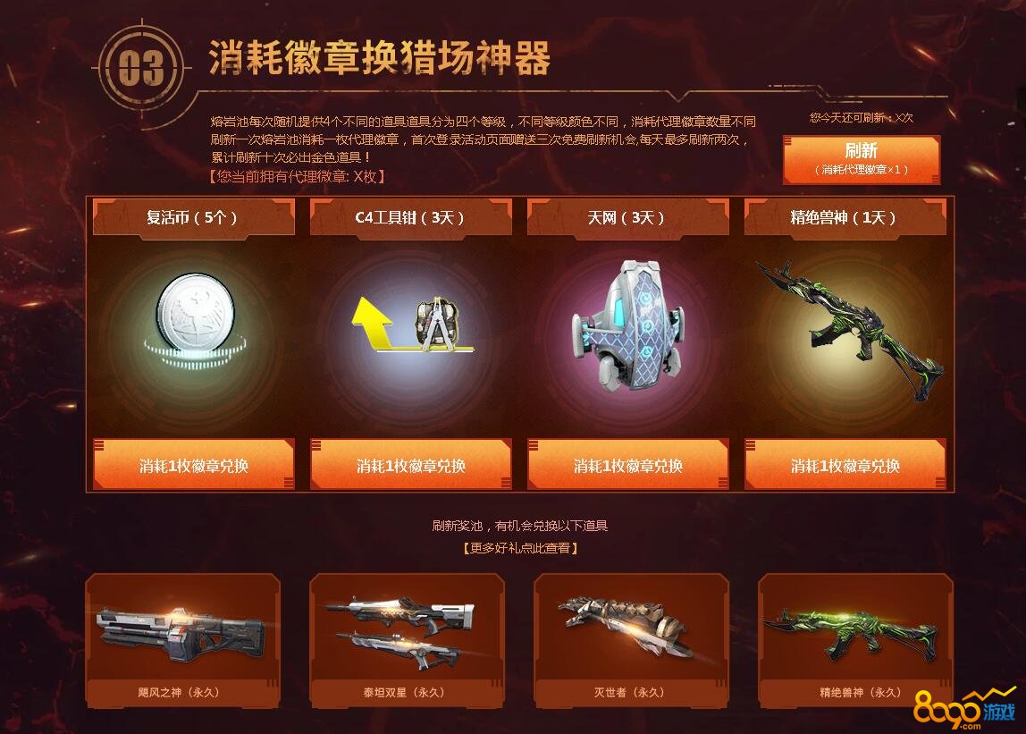 兑换池中的奖励有猎场消耗道具、泰坦双星、飓风之神、精绝兽神、圣光裁决、幽冥毒皇、灭世者等等一堆奖励,每天会给玩家4个道具进行兑换,玩家可以消耗代理徽章进行兑换奖励刷新,不过每天最多只能刷2次,玩家只要累计刷新10次是肯定会出金色道具的,但是金色道具也是分期限和永久的,除了运气之外,玩家最终的就是竟可能的多获得代理徽章,这样才能有机会刷出金色道具。