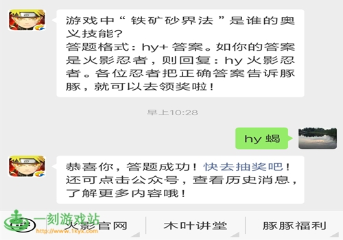 火影忍者每日一题4月4日答案分享_游戏中“铁矿砂界法”是谁的奥义技能?火影忍者:游戏中“铁矿砂界法”是谁的奥义技能?(答题格式:hy+答案。如你的答案是火影忍者,则回复:hy火影忍者。)在火影忍者手游中有很多特色玩法,还有各种不同的福利活动。其中关于微信每日一题有奖问答活动,大家都知道答案是什么吗?这里小编就给大家来分享一下,下面就一起来看看吧!