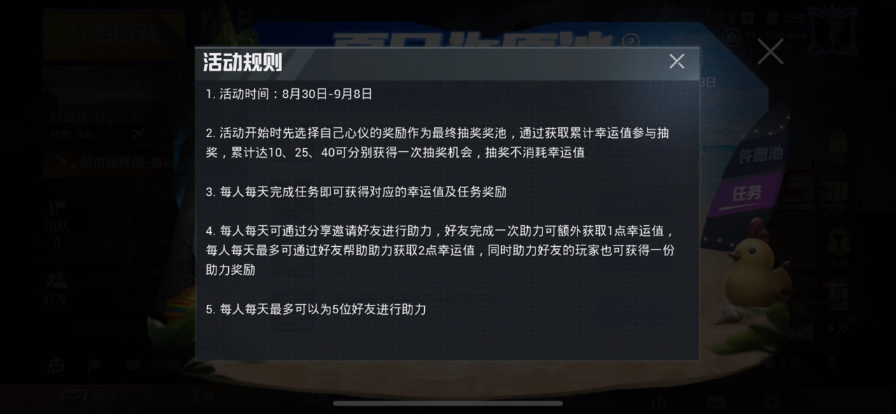4.每人每天可通过分享遨请好友进行助力,好友完成一次助力可额外获取1点幸运值,每人每天最多可通过好友帮助助力获取2点幸运值,同时助力好友的玩家也可获得一份助力奖励。