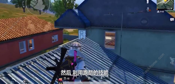 到达房顶之后我们走到房子的最顶端,用冲刺助跑跳到对面的房顶。
