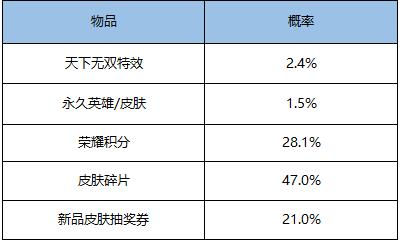 PS:后几种奖励的概率最高,英雄以及碎片、特效的爆率较低,较为看运气;