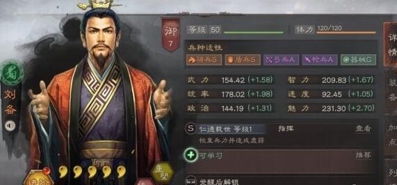 在游戏中刘备的指挥战法仁德载世还是非常好用的,效果是治疗己方两人同时有几率对敌人施加虚弱状态一个回合,如果自己是主将虚弱的几率会有所增加。刘备作为一个控制很足又能治疗的武将还是非常好搭配阵容的,玩家们可以随意搭配哦。他的战法推荐学义心昭烈、盛气凌敌、出其不意,要是前面三个你都不满意可以选择用坐守孤城、长者之风等。