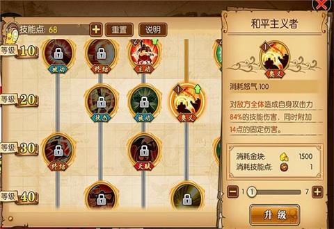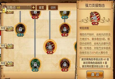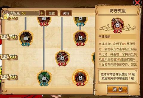被动:攻击强化、防御强化、格挡强化、血量强化、伤害减免强化、血量强化(80级)