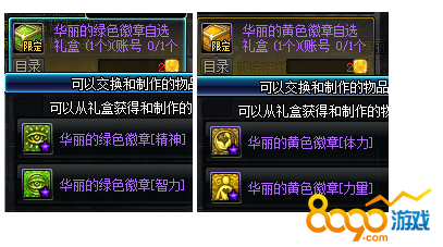 这个南瓜球礼盒是2200点卷一个,可能有的小伙伴会觉得兑换两个华丽徽章有些不值,不过大家可以点击徽章目录了解一下,这两个徽章可不是一般的徽章,绿色是加精神和智力的(绿色徽章专打上衣和下装),黄色徽章是加体力和力量的(黄色徽章专打头肩和项链)。