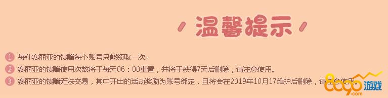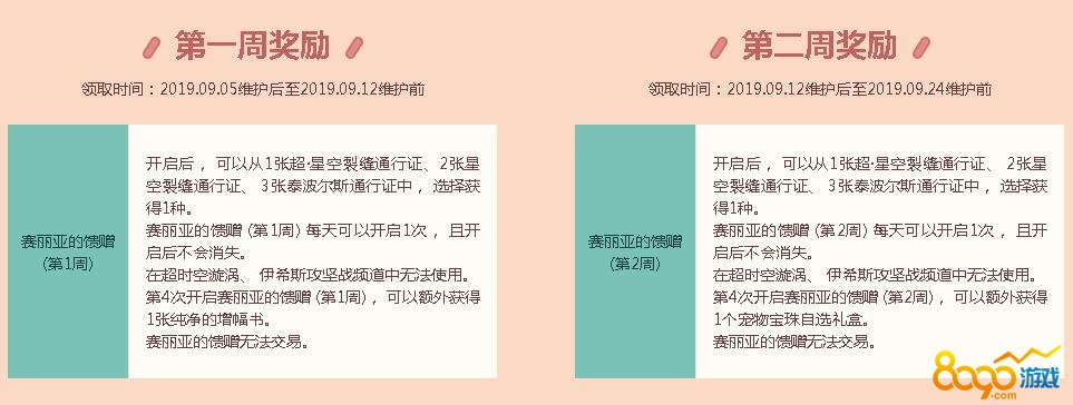 本次更新主要还是以服务器的优化调整为主,在9月5日上线的赛丽亚的馈赠活动的第一周奖励在更新完毕后结束,玩家在更新将无法在领取第一周的活动奖励,同时更新后第二周的活动奖励将进行开放,届时玩家就可以领取第二周的奖励了。