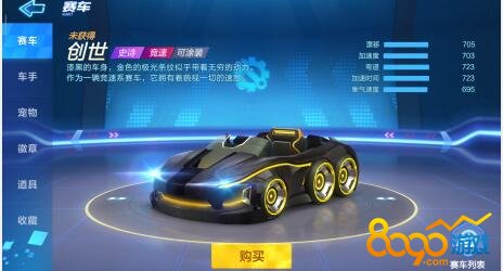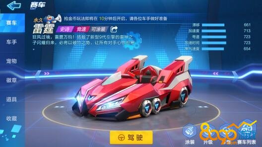 首先我们来看下雷霆的基础属性如何,雷霆漂移661、加速度713、弯道723、加速时间723、集气速度654,从各方面属性来看作为一辆史诗级别的竞速车还算是中规中矩,虽然不是很亮眼,但是也不差,在属性加点方面还是选择10-10-5-10的加法,主要还是因为在漂移方面不是很好,需要通过加点来弥补。那么作为史诗竞速车和创世比起来如何呢?