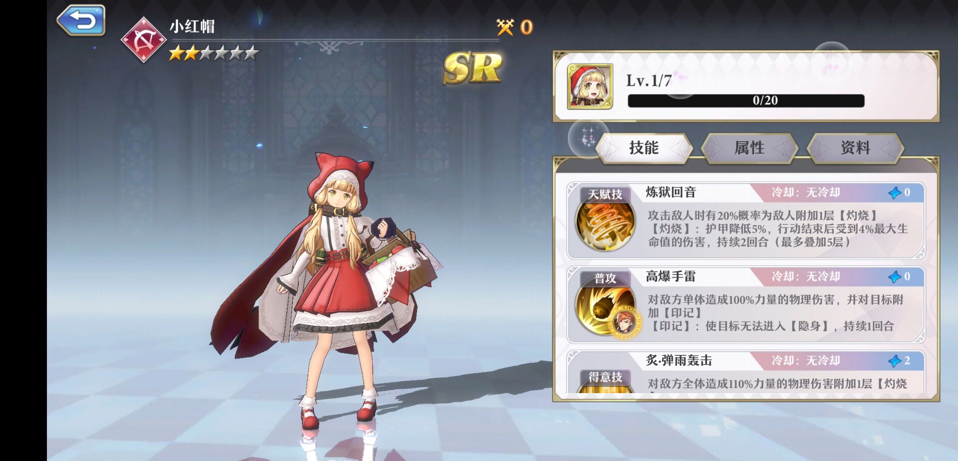 英雄属性水属性英雄获取召唤获得克制关系克制关系天赋技能岚切的极意闪避后获得15%力量的护盾普攻疾突单体攻击,对目标造成100%力量的物理攻击(和小红帽有组合攻击)得意技能死斗单体攻击,造成500%力量的物理伤害,附加决斗效果奥义技能奥义一闪单体攻击,对敌人造成不可闪避的400%力量的物理伤害,释放完自己需要休息一个回合支援技能奥义岚切战斗开始获得1能量,对单体造成不可闪避的200%的物理伤害