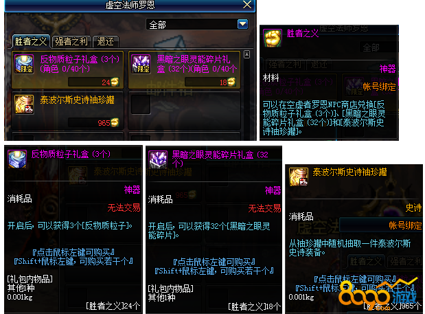 这两个材料能兑换的奖励还是很不错的,比如胜利之义可兑换的反物质粒子(每个角色可兑换120反物质粒子),再比如强者之利可兑换的45物理/魔法/独立攻击力+15力量/智力上下衣宝珠,这些对大多数人来说(尤其小号)都是非常好的东西。