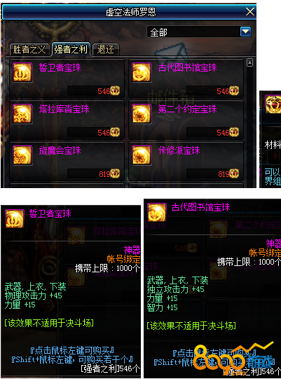 当强者之利累积到一定数量之后,可以拿去找虚空法师罗恩兑换各种附魔宝珠,这些副本宝珠很多属性都很不错,比如衣服裤子专用的45物攻/魔攻/独立+15力量/智力比起目前的毕业附魔也就少了5点攻击和5点力量(或智力)而已。