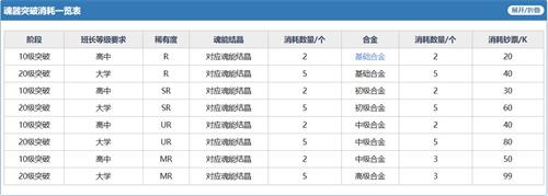 其中,R级魂器的突破需要基础合金、SR级的魂器突破需要初级合金、UR级的魂器突破需要中级合金、MR级的魂器突破则需中级和高级。简单来说,品质越高的魂器、突破所需的合金珍稀度越高。