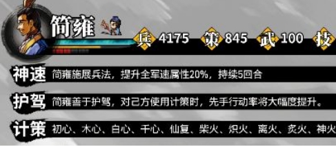 护驾:简雍善于护驾,对己方使用计策时,先手行动率将大幅度提升。