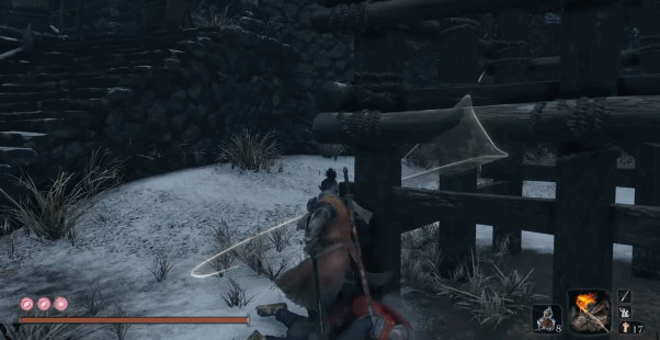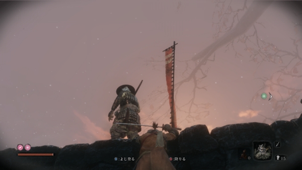 边走阶梯,边使用钩绳,下降的过程中会遇到“寄鹰众(逢魔刻·手里剑)”的攻击,落脚点很窄,不小心就会掉下去,所以干脆无视它们,直接一口气先下去吧。