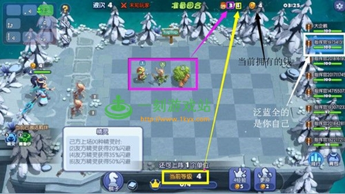 黄框框:可以理解为基地等级,目前4本基地,可以上场的卡牌上线为4。黄框框右边的是花费5个金币升基地,只有4点经验,注意使用!