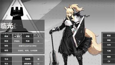 临光,原名玛嘉烈临光,是一位隶属于库兰塔种族的女性重装类型干员,品级达到了四颗星,于中后期有一定的操作和入手价值,值得小伙伴关注和入手。在着装上,临光是一位穿搭较为厚实的干员,整体以黑色和白色为主色调,配以威猛的身材和强劲的输出效果,可适应任何作战。
