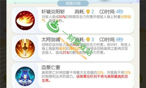 被动招(需要30级觉醒后为干将妖灵才能开启):血祭亡妻,莫邪死亡时将回复干将最大生命值的20%,并提高干将20%的物理和法术防御力。该效果仅针对干将和莫邪最高形态生效。