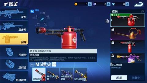 一把能够喷射火焰,造成持续性伤害的武器。适合近距离作战,在灵活走位的同时,依靠喷火器在近距离作战可谓是王者。但是使用喷火器一定要靠近对手,喷火器的伤害较近,一旦拉开距离一定要重新换上中远距离枪械进行对战。