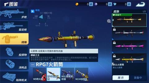 RPG7火箭筒,是游戏中唯一一把火箭筒类枪械。单发装填的武器,伤害范围广,距离远,伤害大。但是子弹飞行速度较慢,能够被对手察觉躲避。所以使用这把枪的时候预判对手走位开枪是关键,切记不要近距离时候使用,因为爆炸范围较大,近距离可能波及到自己