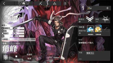 角峰,隶属于谢拉格阵营,是一位品质达到四星级的男性重装战士,被赋予了强大的近战和防护能力,并能同时抵御敌方三个敌人。并且,其最低生命值为1273、最高则达到3235,配置241~670之间的防御属性,可适应任何环境下的作战,亦能为己方后排带来安全保障。并且,由于角峰被赋予了一定的输出能力,因而也不会拖累玩家的后腿。