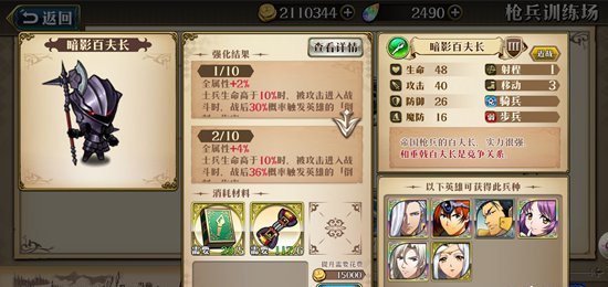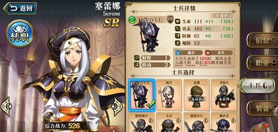塞蕾娜拥有的三级转职兵种有:姬武神(皇家卫士)、驱魔师(皇家卫士),练兵场解锁兵种有龙骑兵、暗影百夫长。