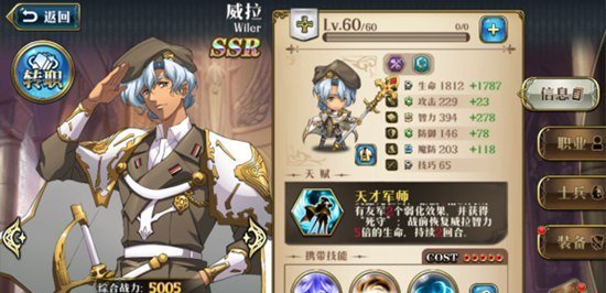 轻度培养转职线就是学者→智士→军师,技能搭配为强化+群体治疗+战术撤离,虽说这样已经包含了大部分威拉的技能,但是对于全面性来说还不是特别完全,建议可以转职双线。