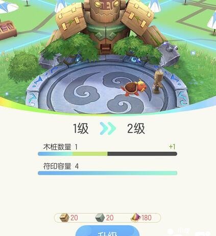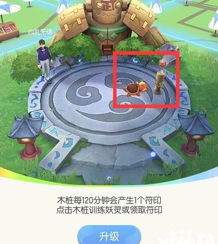 在训练场中,每2个小时可以产生1个我们放入训练的妖灵的妖灵符印,点击右侧的木桩可以放入训练的妖灵,点击我们的妖灵可以收集符印,妖灵符印可以用于唤醒妖灵或者是升级妖灵用,一般推荐是用于升级我们抓到的比较好的妖灵。2个小时才生产1个符印,确实有些慢,我们可以点击下方的【升级】按钮升级训练场。