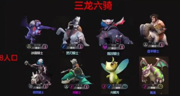骑士:冰霜骑士,炼狱骑士,灵刃骑士,邪灵骑士,盘羊骑士,龙骑士(主力为,炼狱骑士,灵刃骑士,龙骑士,这三个能三星就追三星,后期主力点,其余两星差不多,有条件3也可以,6骑几率加减伤害护盾,能抗)