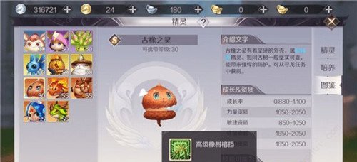 能以此看出古橡之灵是持续性的防御精灵,所以它比较适合要一直承受伤害的妖兽职业。这边推荐古橡之灵在分配点数的时候多在体质和法术这两点做文章,体质为精灵提供生命值,法术能增加古橡之灵技能的强度。