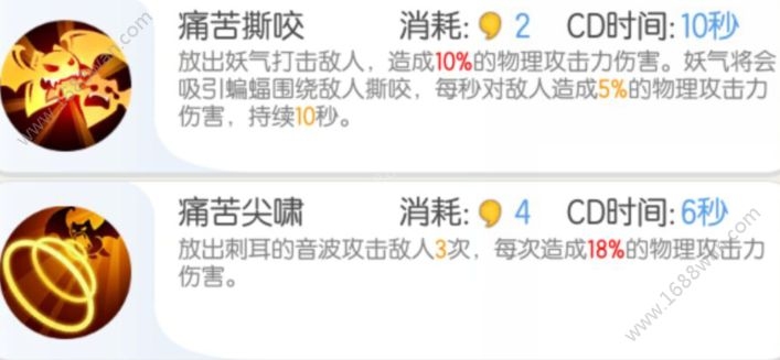 小蝙蝠系列的妖灵,主要依靠的就是“痛苦尖啸”来给予敌人造成大量伤害!加上“痛苦撕咬”给予敌人一定的物理伤害的同时,每秒对敌人造成一定比例的物理伤害,持续一定时间来不间断的消磨敌人的HP值!但是建议“痛苦撕咬”技能先使用,因为“痛苦撕咬”CD恢复时间长,而一旦“痛苦撕咬”CD恢复一次,差不多够我们释放俩次“痛苦撕咬”给予对手重创!