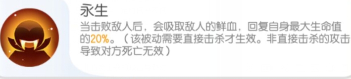 而小蝙蝠系列的妖灵有一个非常特殊的技能,那就是“永生”!每当我们击败敌人后,妖灵便会直接吸取敌人的鲜血,回复妖灵自身最大生命值的一定比例,而这个技能也有一个前提条件,那就是这个技能的激发,必须是要在直接击杀的情况下才能生效的,非直接击杀的攻击导致对方死亡是无效的。换句话说就是只有妖灵在最后一下补刀将目标击杀才有用,否则这个技能无法使用!