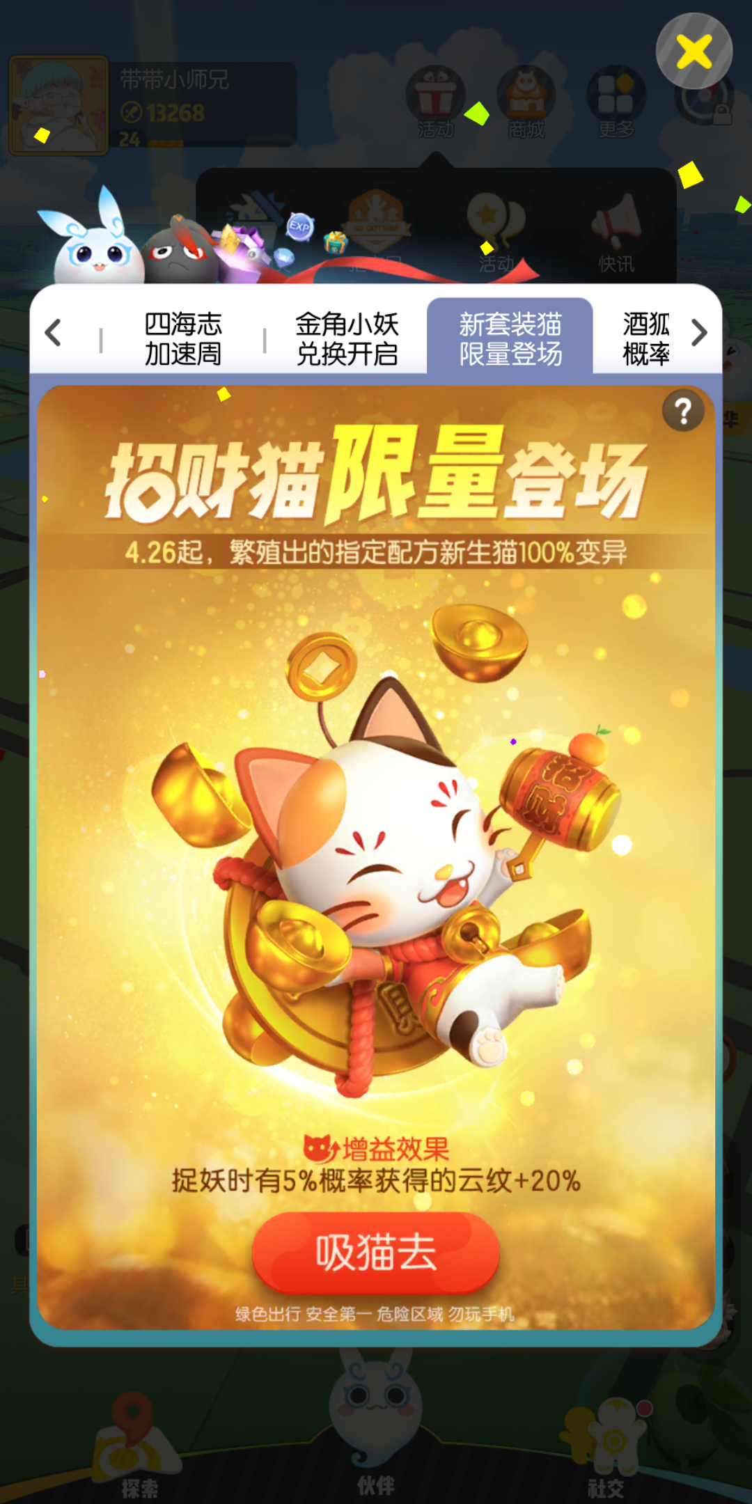 一起来捉妖中近日推出了一款限量版猫咪,那就是可爱的招财猫啦,那么我们应该怎么才能得到招财猫呢?它的效果又是什么呢?现在我们一起来看看吧。