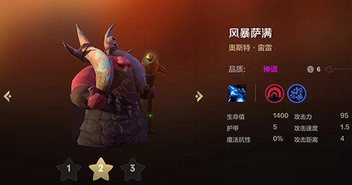 风暴萨满外号风暴萨满品质神话属性星级1星2星3星费用468生命值70014002800攻击力4795190护甲555攻击速度1.51.51.5魔法抗性0%0%0%攻击距离444