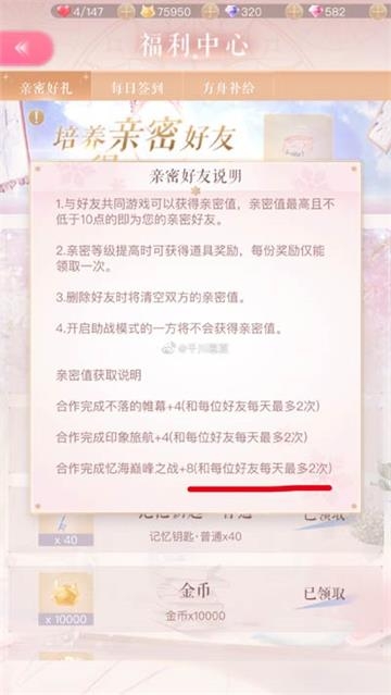 说明页面上的括号内写着:和每位好友每天最多两次。这句话的意思其实是:你和B好友,每天每项最多加两次亲密度,每次+4(帷幕/印象),忆海则是+8。那么在忆海开之前,每天最多+16亲密度。