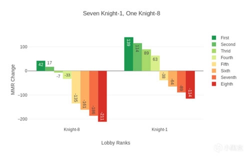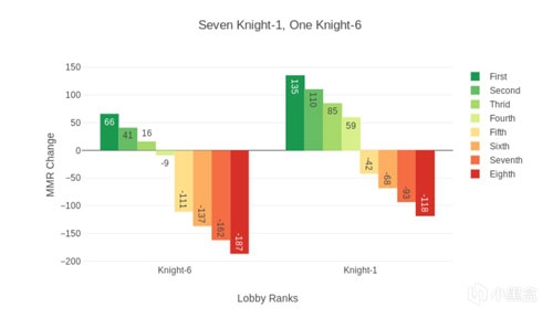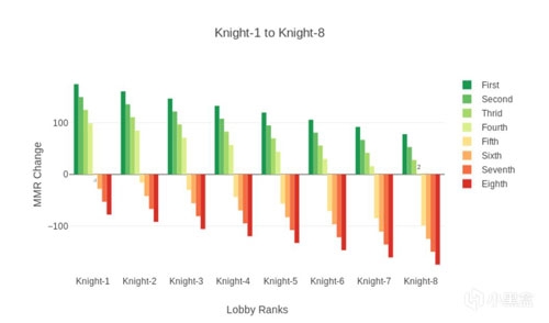 注意当最高段位和最低段位相差7段,其他玩家段位居中时,最高段位玩家获得第四名仍将增加MMR,反之亦然。