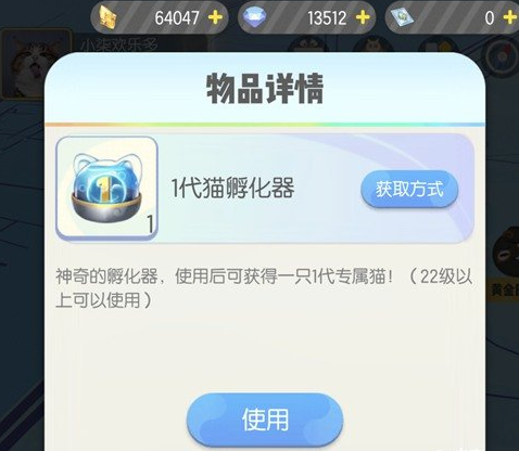 介绍:神奇的孵化器,使用后可获得一只1代专属猫!(22级以上可以使用)