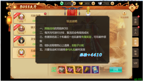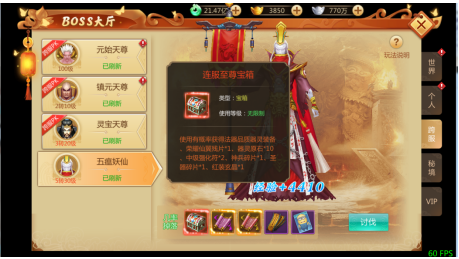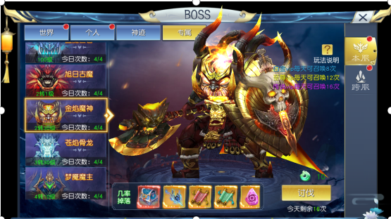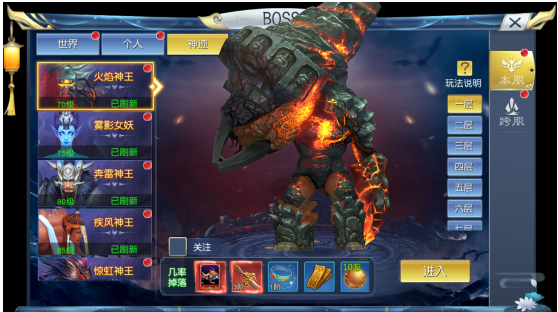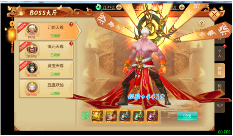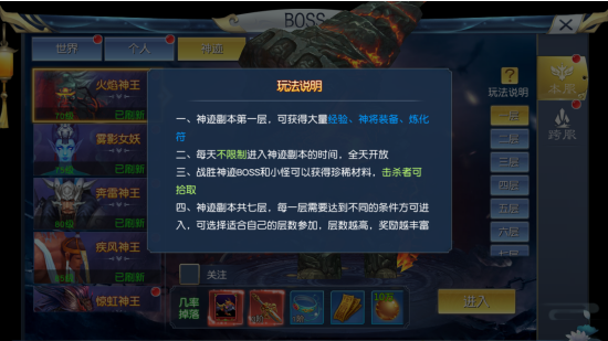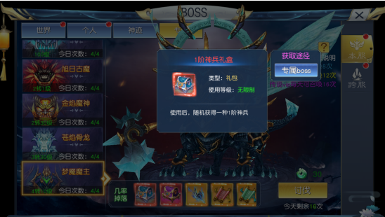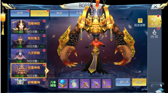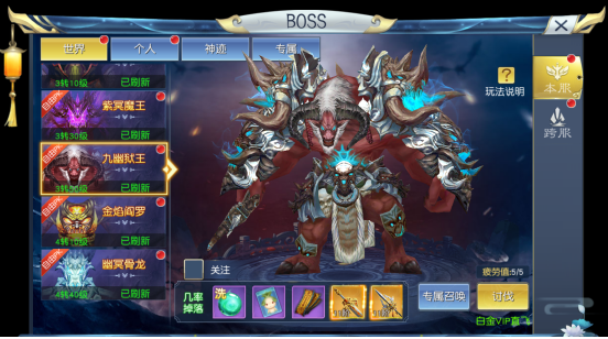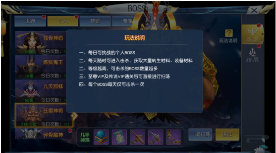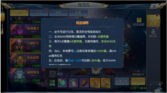 点击主界面boss图标,可以直接进入boss大厅,boss大厅分为世界boss、个人boss、跨服boss、秘境boss和vipboss。
