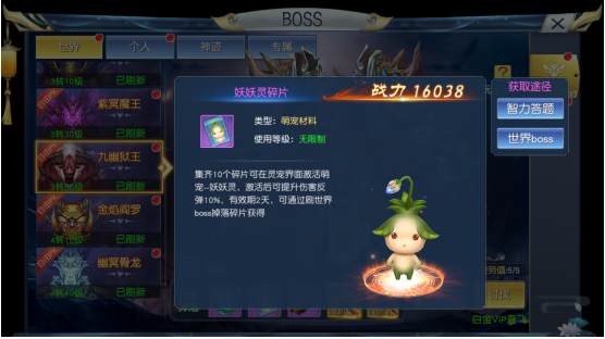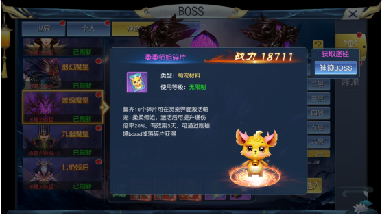世界boss有几率掉落极品装备,还有机会掉落法阵和萌宠—妖妖灵。