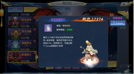 个人boss可以获得转生材料,还有机会掉落萌宠—摇滚砖家。