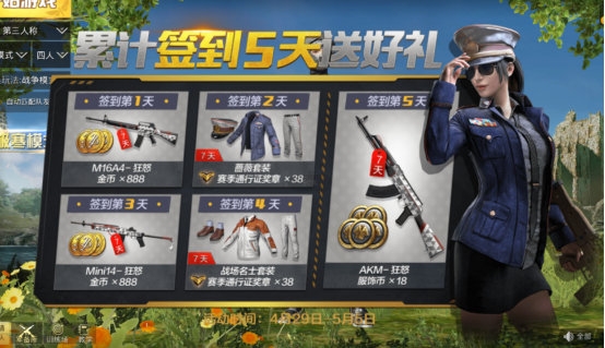 五月狂欢重磅礼,海量奖励等你领!在4月29日至5月5日期间内,玩家登录游戏就可以在活动界面进行签到。当玩家累积签到相应的天数,就可以领取限定的“蔷薇军服”套装(7天)、“战场名士”套装(7天)和“狂怒”枪械皮肤(7天)。此外,“五月狂欢签到活动”更有海量金币、赛季通行证奖章和服饰币等你签到领取。玩家累计签到1天、3天和5天,就可以分别领取到“狂怒”系列枪械皮肤;玩家在累计签到2天和4天分别可以领取珍稀的“蔷薇军服”套装(7天)和“战场名士”套装(7天)。