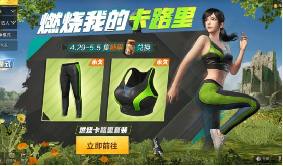 相信在现实生活中,每一位小伙伴都聆听过“洗脑”神曲——“燃烧我的卡路里”。现在,我们要在《刺激战场》中来一场“健身运动”活动了,告别糖果甜甜圈,燃烧我的卡路里。在4月29日至5月5日期间内,玩家在经典模式内进行一场游戏或分享一次游戏就可以在活动页面领取“糖果”道具。每日最多可以获得4个“糖果”道具。当玩家累计到足够数量的“糖果”道具就可以在活动页面兑换“燃烧卡路里”运动套装和内藏海量金币的“大吉金币宝箱”。只需要10个“糖果”就可以兑换到永久的“燃烧卡路里”运动套装,机会难得,赶紧行动!
