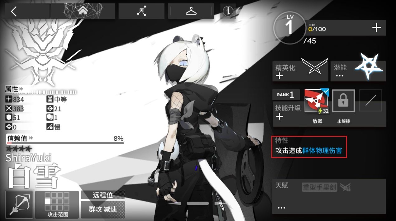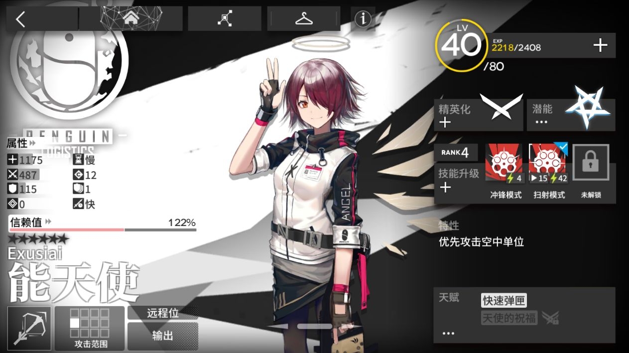 其中,单狙又分对空狙与非对空狙。以能天使为例,其特性显示“优先攻击空中单位”,此为对空狙。在一个正常卡组中,建议保持两个对空狙。在开荒过程中,对空狙的泛用性远大于非对空狙。