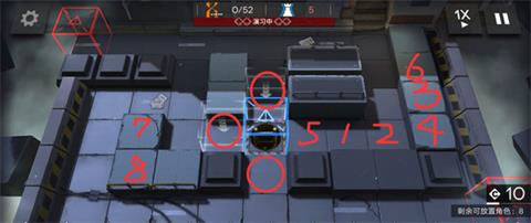 (1)先把所有箱子在红圈位置摆放完毕,在第一个狗到来前在1号位放置击杀回C先锋(例如翎羽、红豆)。
