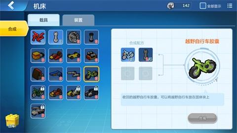 1、合成越野自行车需要使用道具“机床”,在工作台中消耗4个木板和4个石块可以合成机床。