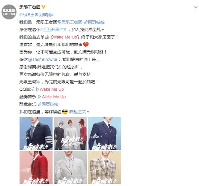 目前“无限王者团”已经出了单曲“WAKE ME UP”,以很燃的歌词和曲风,讲述了他们的故事,脱下戎装,换上绅士装的勇士们,真的很帅。目前这首单曲已经上线各大音乐网站了,感兴趣的朋友可以去听一听。